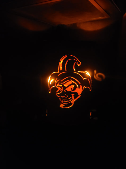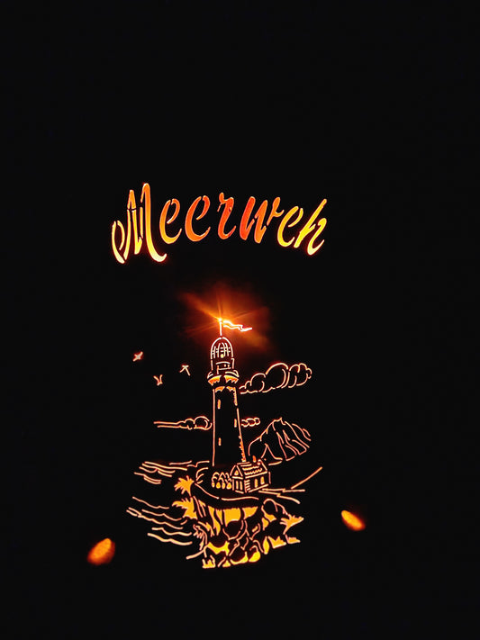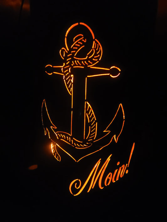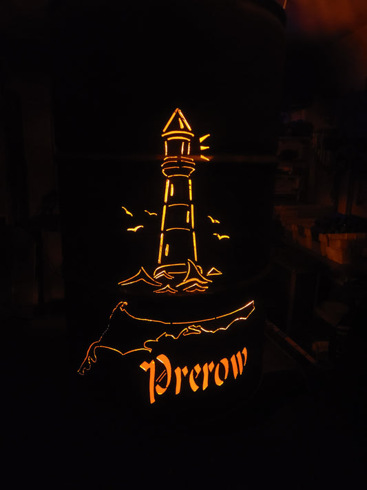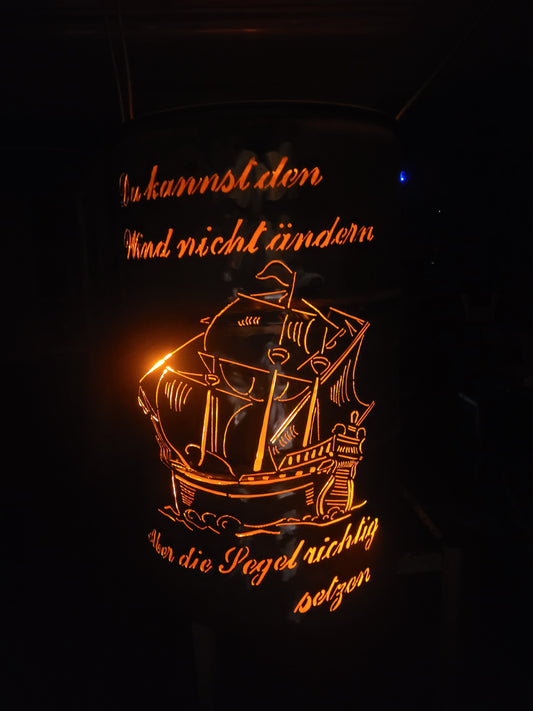 Feuertonne mit Schiff als Motiv und einem Schriftzug