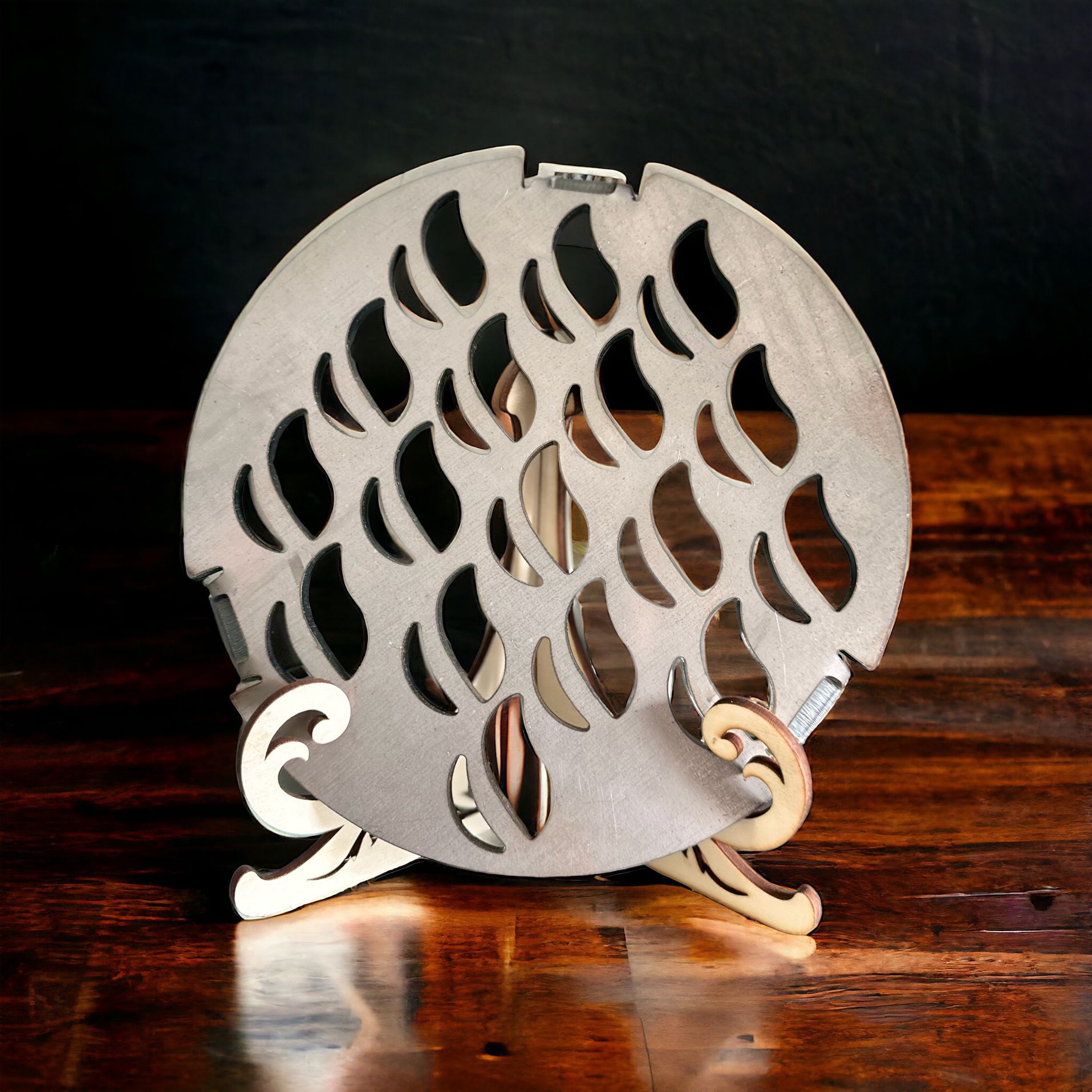 Der 6mm Stahl Grilleinsatz passt perfekt in die 20cm Öffnung einer Feuerplatte und kann durch abgekantete Laschen nicht verschoben werden. Das Grillrost verhindert, dass Grillgut in die Feueröffnung fällt .Die direkte Hitze in der Mitte der Feuerplatte wird optimal genutzt und es bleibt kein Zentimeter auf Feuerplatte ungenutzt! Ideal für Steaks und alles was SCHARF ANGEBRATEN werden muss! Die 6mm Plattenstärke speichert die Hitze optimal! Aufwändig gelasertes Flammendekor . Den Grillrost einfach in der Spülmaschine reinigen Details zum Grillrost: Durchmesser Grillrost: D210mm (passt perfekt auf ein 20cm Feuerloch) Materialstärke: 6 mm Material: Stahl S235