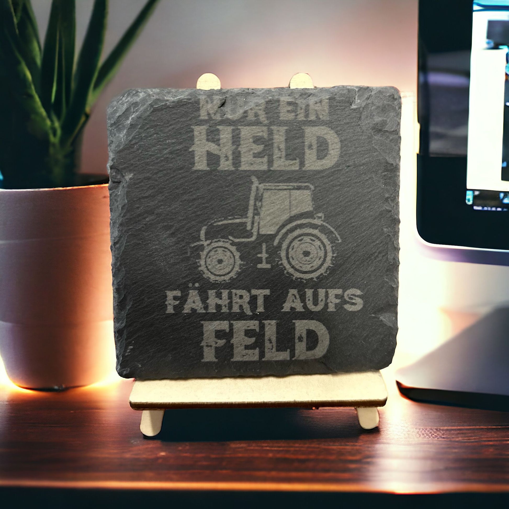 Schieferuntersetzer "Nur ein Held fährt aufs Feld"
