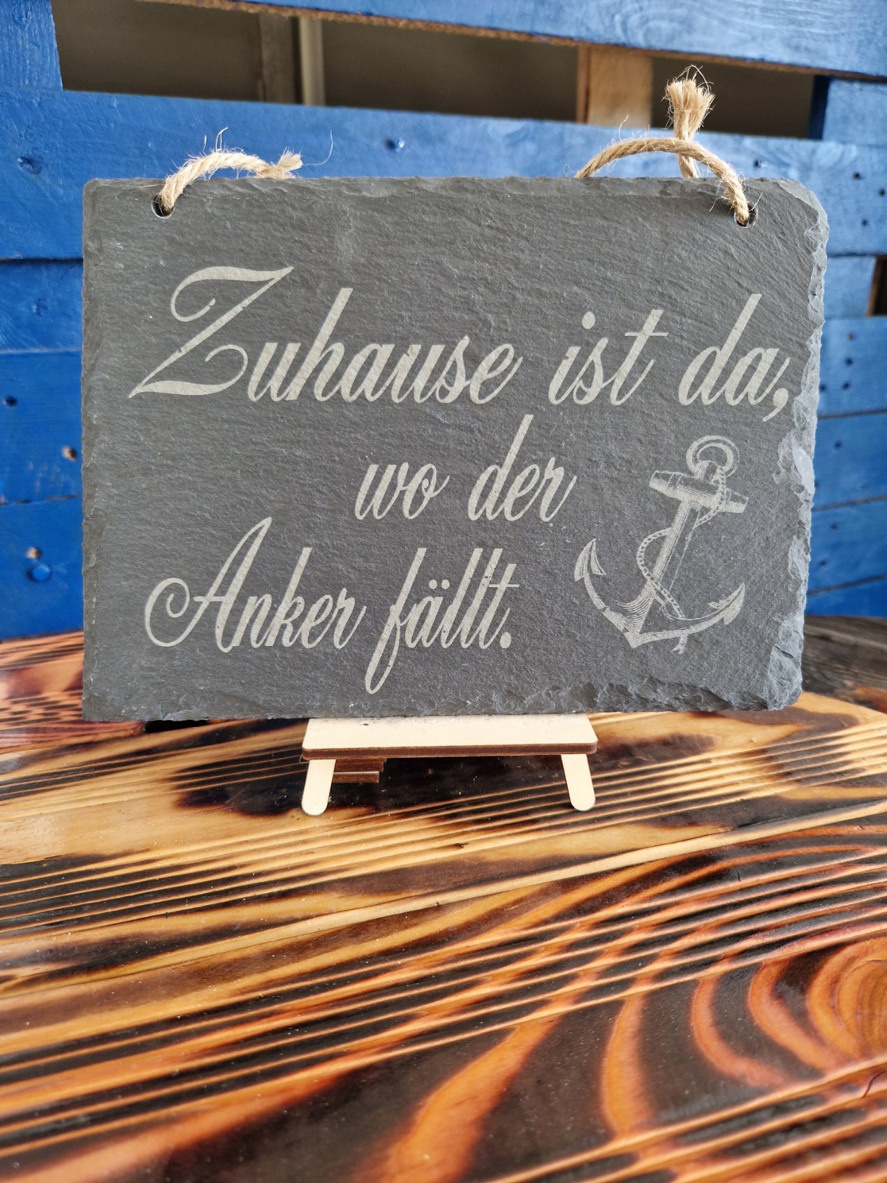 Schiefer-Schild Eckig " Zuhause ist da, wo der Anker fällt"