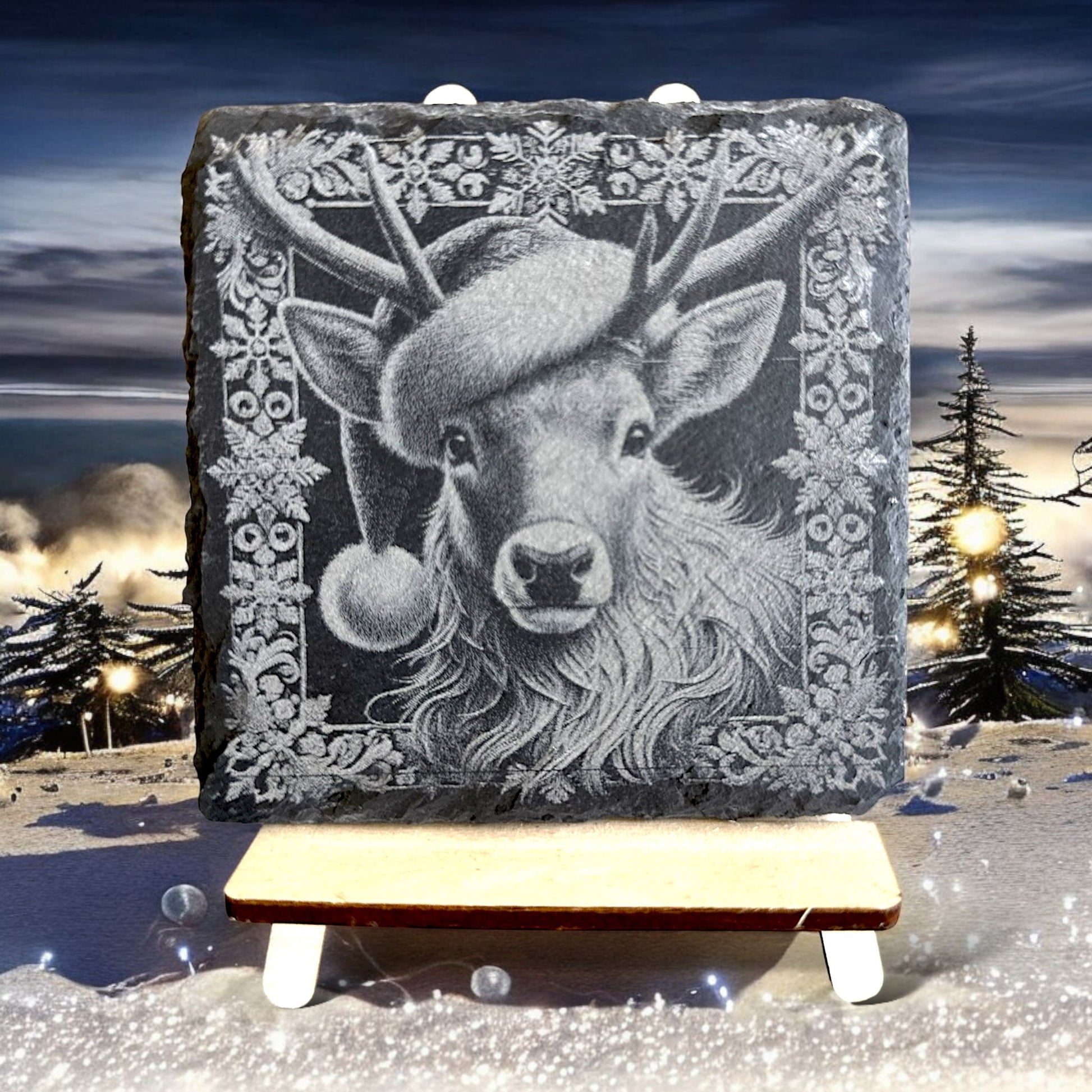 Schiefer Untersetzer "Weihnachten Rentier mit Mütze 3 D"