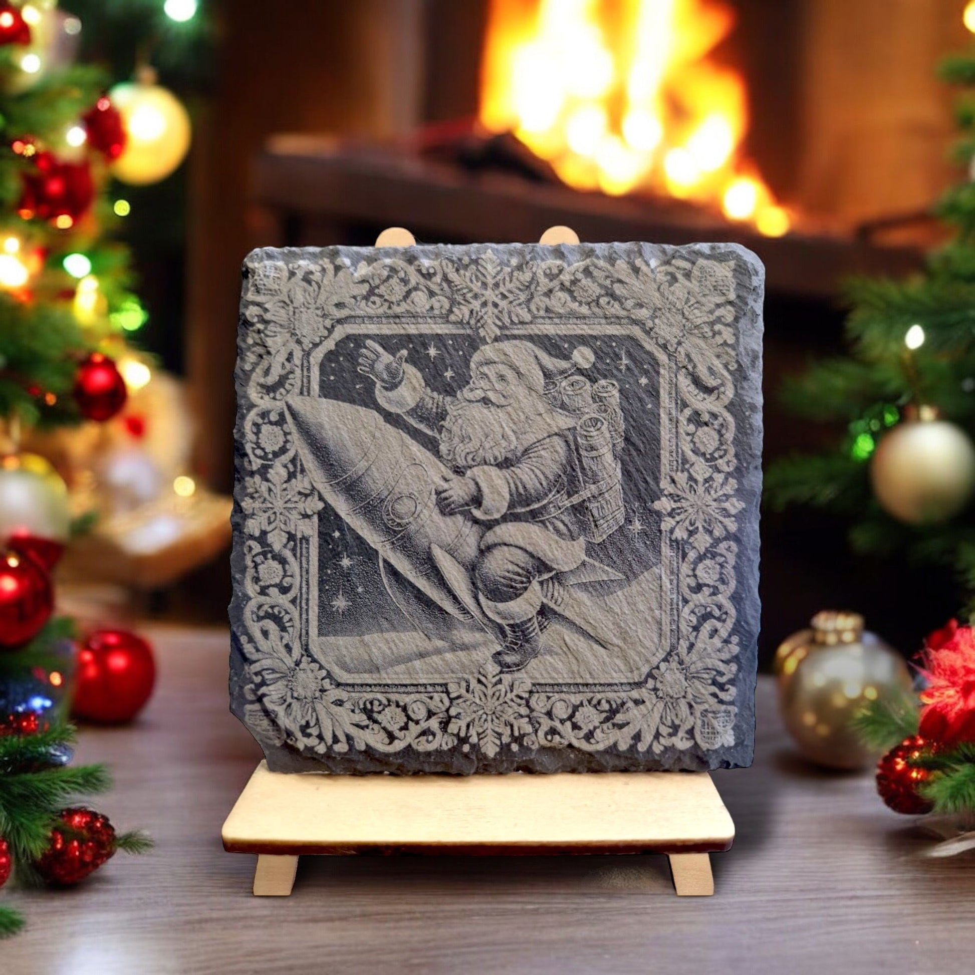 Schiefer Untersetzer "Weihnachtsmann auf einer Rakete 3 D"