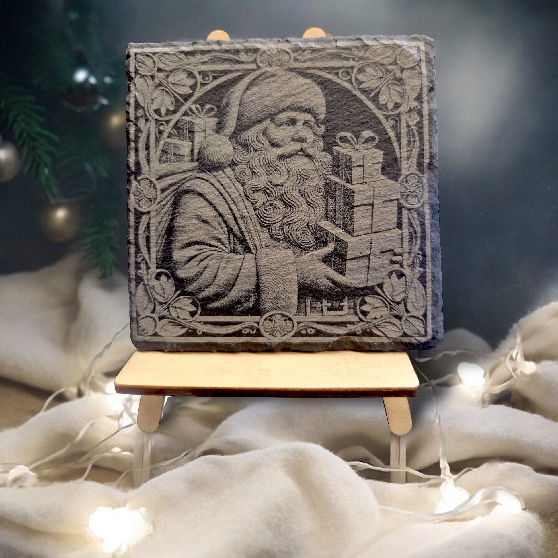 Schiefer Untersetzer "Weihnachtsmann mit Geschenken 2 " 3 D"
