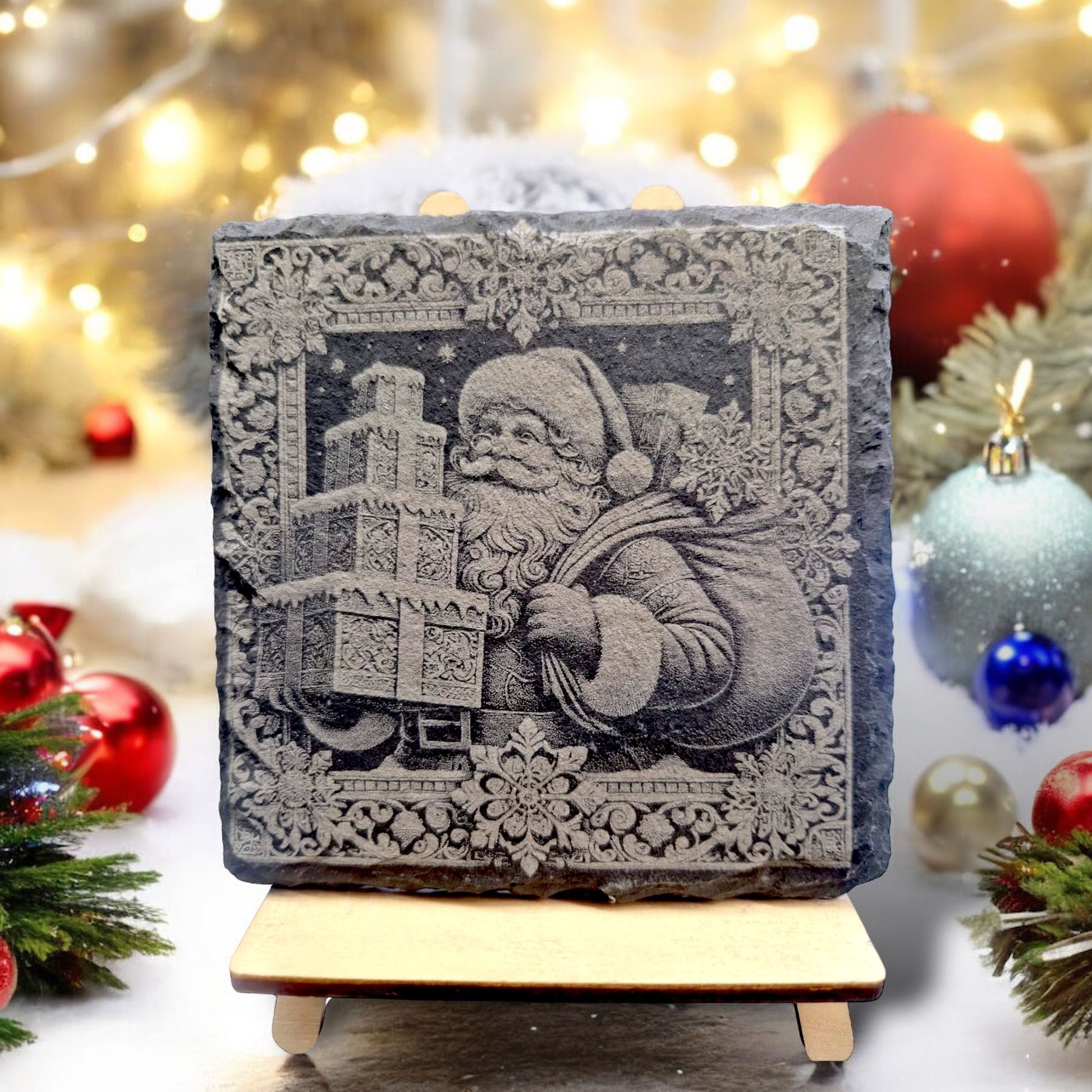 Schiefer Untersetzer "Weihnachtsmann mit Geschenken 3 " 3 D"