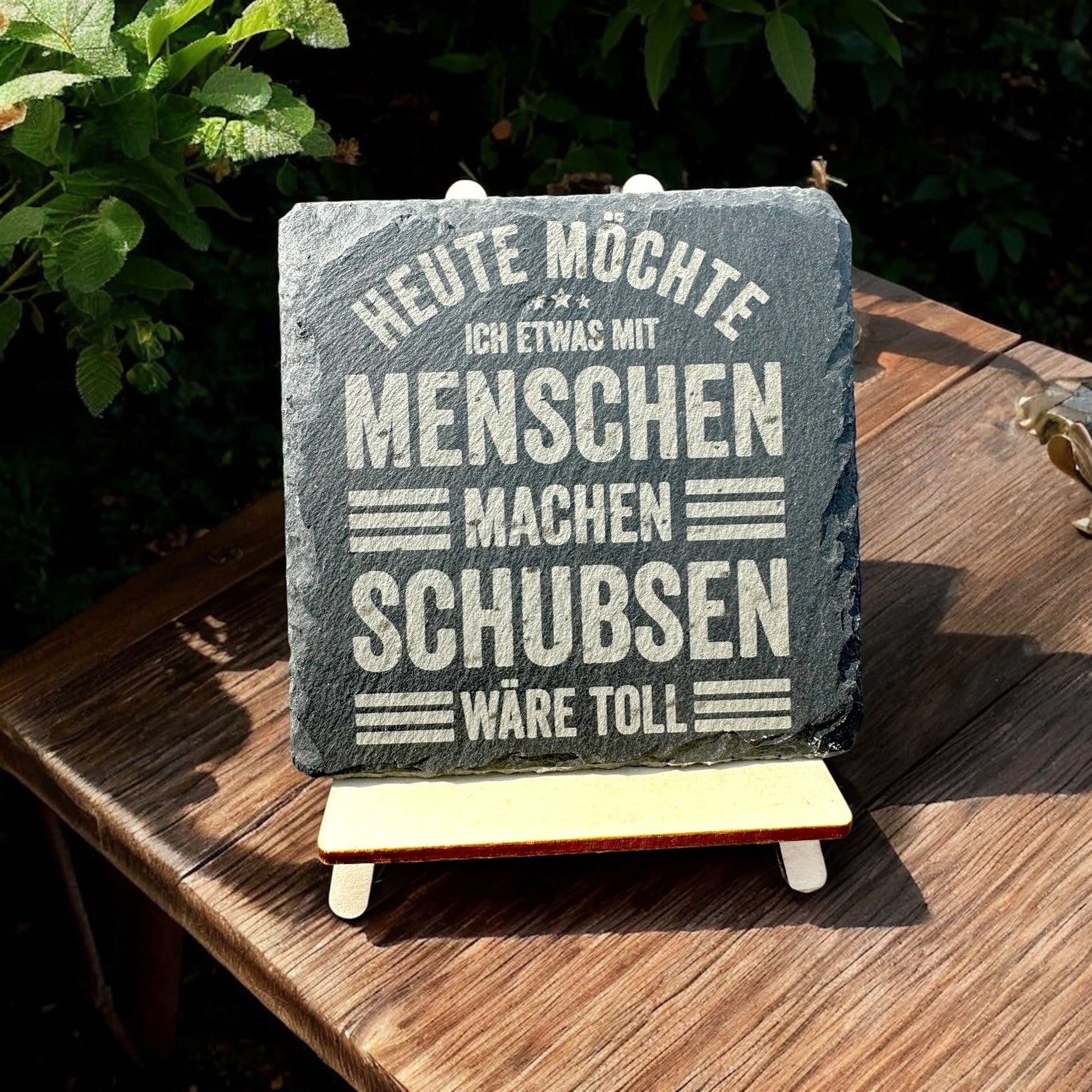 Schieferuntersetzer "Heute möchte ich was mit Menschen machen, schubsen wäre toll!"