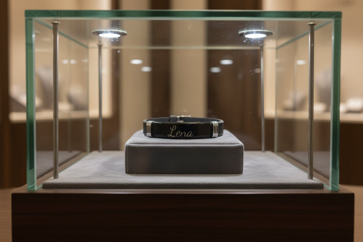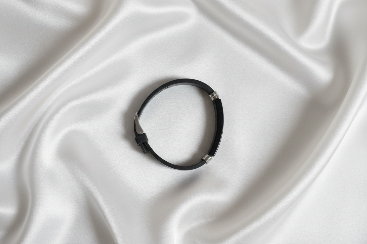 Mit einer individuellen Gravur wird das Armband zu einem persönlichen Begleiter – perfekt für Alltag, Sport oder als besonderes Geschenk. Erhältlich in Schwarz oder Silber.